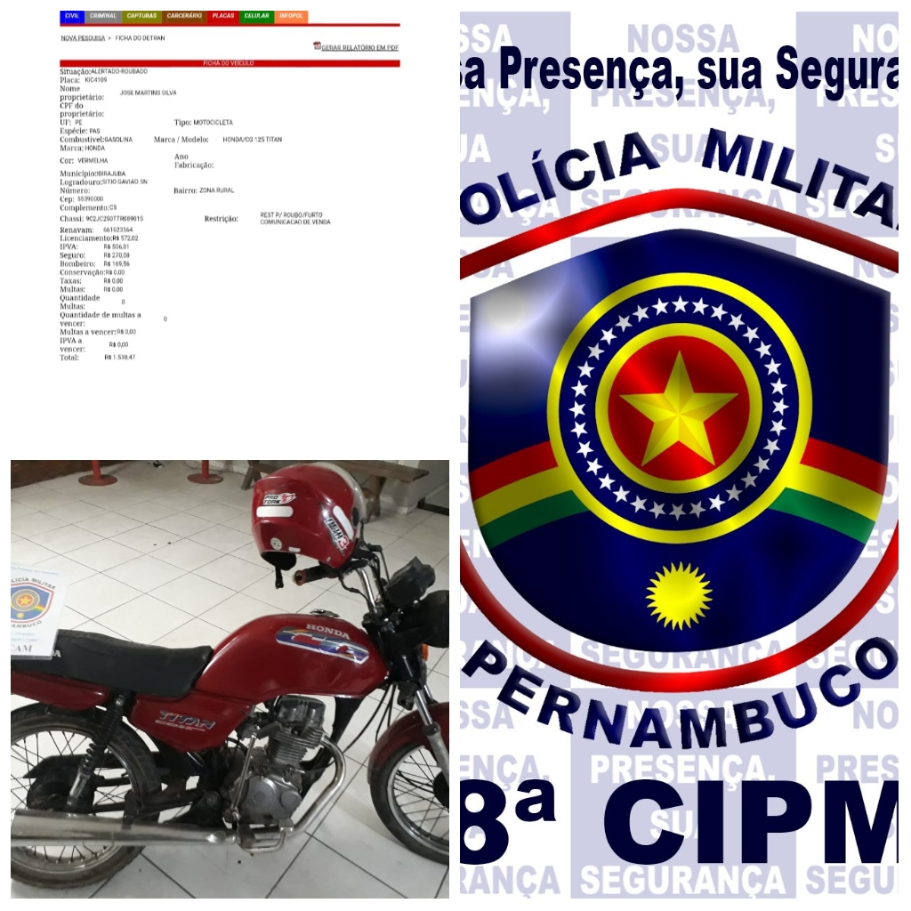 Nesta data, 05 OUT 2019, por volta das 23:30, ao realizar operacao abordagem na cidade de Pesqueira, o efetivo de Rocam da 8ª CIPM tomou conhecimento atraves da central de operações que, possivelmente a moto que havia sido roubada por volta das 19h:40, teria sido abandonada por trás do ferro velho no bairro eucalipto.