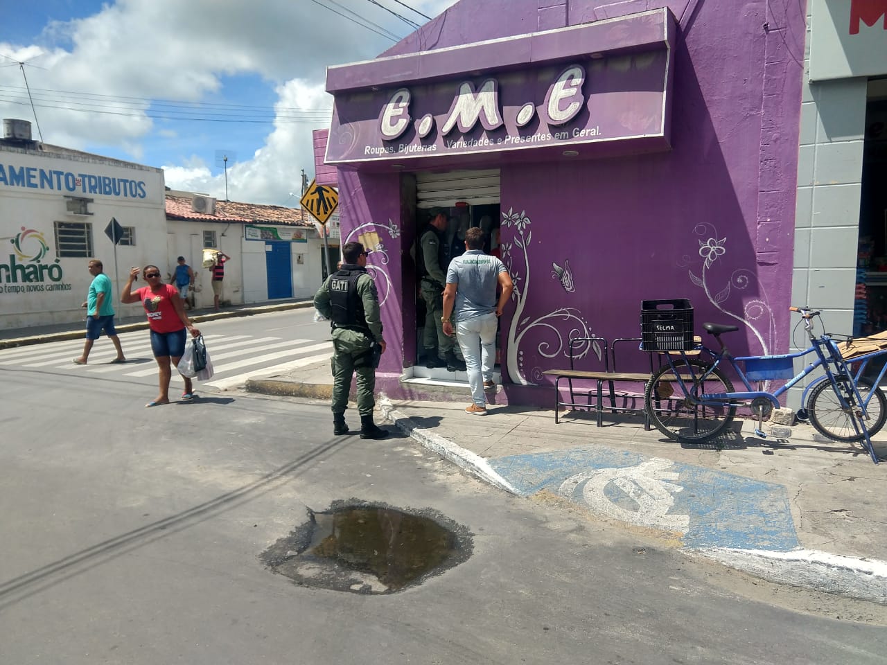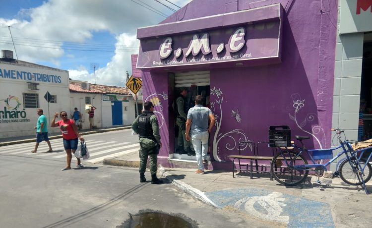 No dia 06 ABR 2020, por volta das 10:00, a equip do GATI da 8ª CIPM juntamente com o efetivo da GT de Sanharo, prestaram apoio a vigilância sanitária do município, no intuito de coibir comerciantes que estariam descumprindo o Decreto do Governo do Estado de Pernambuco, que estipula medidas temporárias de enfrentamento e combate a pandemia do COVID-19.Durante a ação, os militares flagraram a loja de confecções E.M.E, com as portas abertas e uma funcionária em seu interior, provavelmente para prestar atendimento ao público.