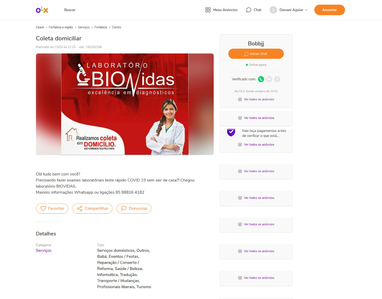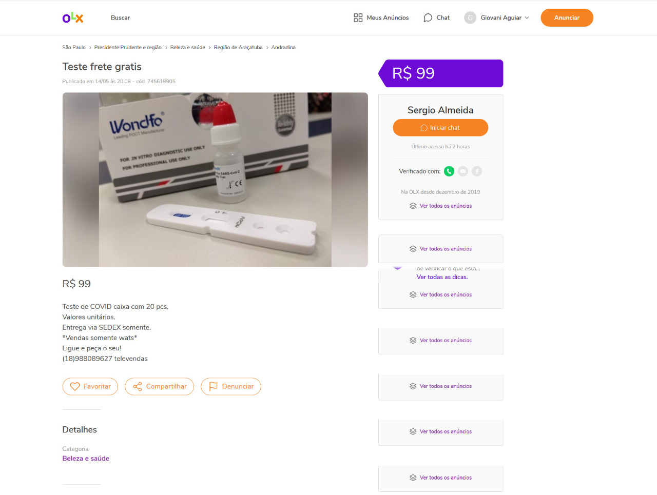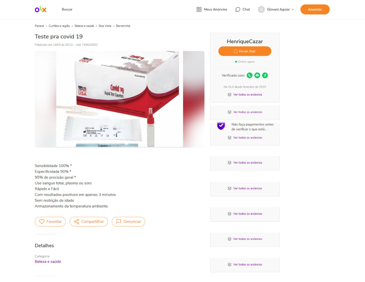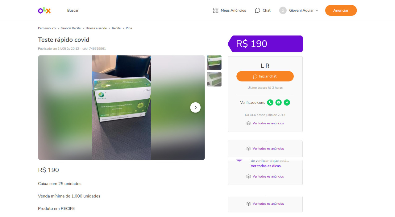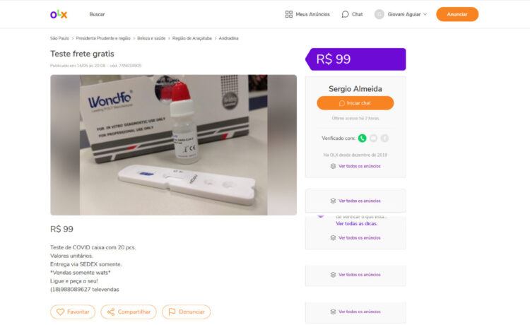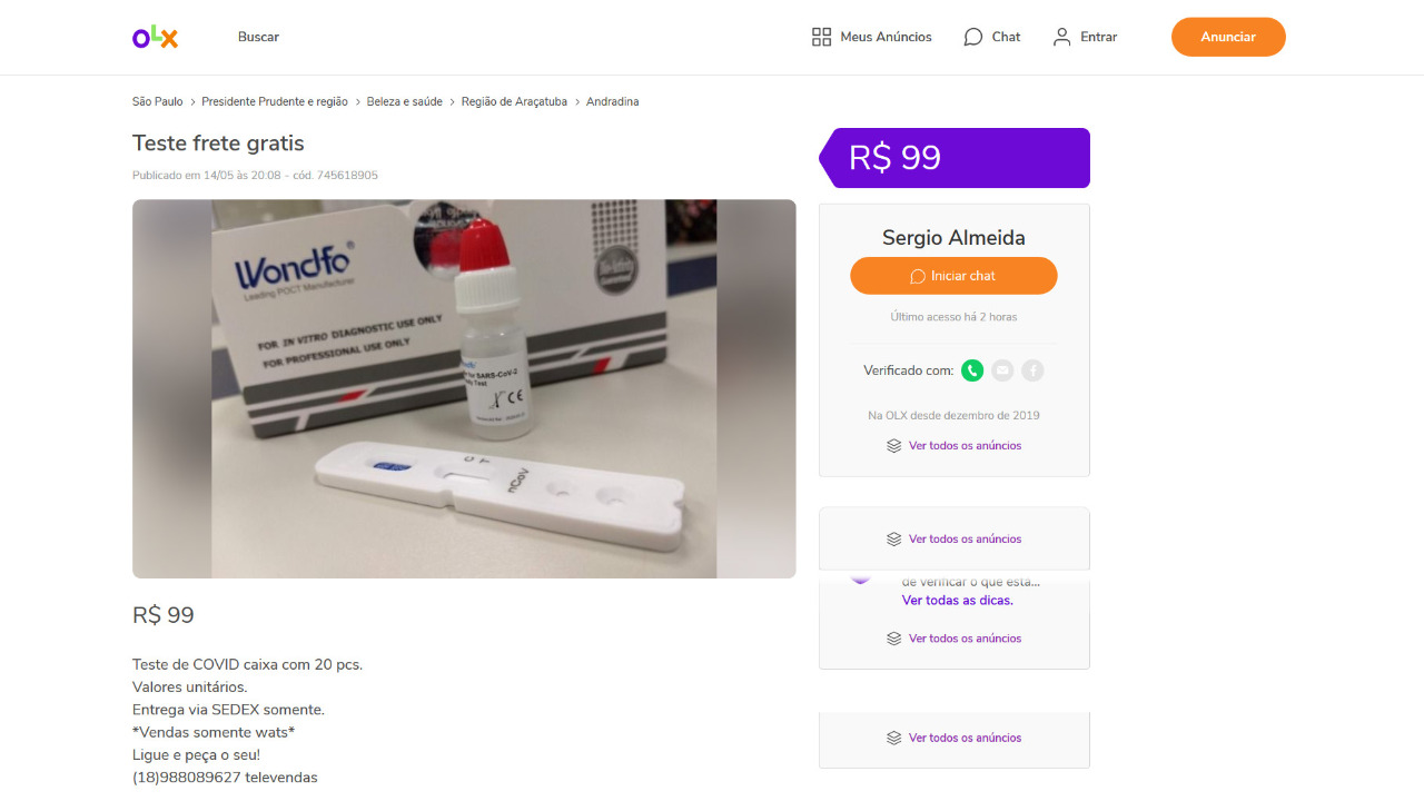 A Polícia Federal alerta para um novo golpe que está sendo aplicado *em sites de compra e venda online e que promete testes rápidos de coronavírus por um preço abaixo do mercado, bem como a coleta de material orgânico para exame laboratorial na residência da pessoa. Num dos maiores sites de compra e venda no Brasil, 125 (cento e vinte e cinco) vendedores com ofertas similares já foram excluídos e 58 mil propagandas enganosas de produtos que garantiam prevenir, aliviar ou curar os sintomas do coronavírus. 0s testes para detectar o novo coronavírus são realizados apenas por profissionais da área da saúde. No entanto, muitas pessoas no desespero de querer saber se estão ou não com a doença, acabam caindo em fraudes que estão sendo anunciadas em sites de compra e venda online.