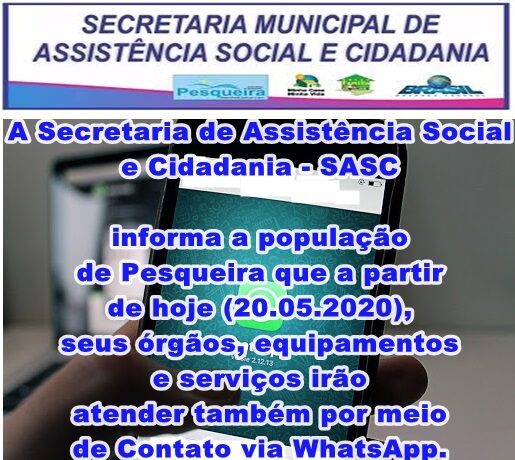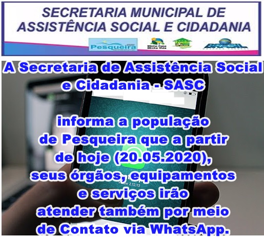A Secretaria de Assistência Social e Cidadania – SASC, informa a população de Pesqueira que a partir de hoje (20.05.2020), seus órgãos, equipamentos e serviços irão atender também por meio de Contato via WhatsApp.