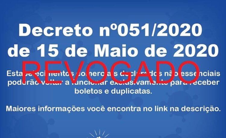 Atenção, a Prefeitura de Pesqueira informa que o Decreto Nº 051 de 15 de Maio de 2020, bem como o Decreto Nº 052 de 19 de Maio de 2020 foram revogados.