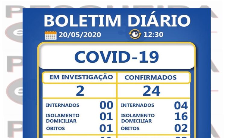 Temos também 24 CASOS CONFIRMADOS, SENDO: 04 DESSES ESTÃO INTERNADOS; 16 EM ISOLAMENTO DOMICILIAR; 02 ÓBITOS CONFIRMADOS; 02 CURADOS.