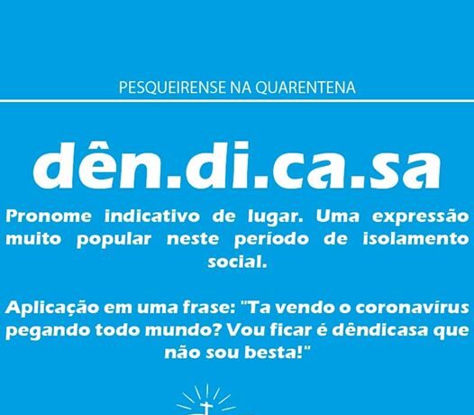 Aplicação em uma frase: “Ta vendo o coronavírus pegando todo mundo? Vou focar dêndicasa que não sou besta!”