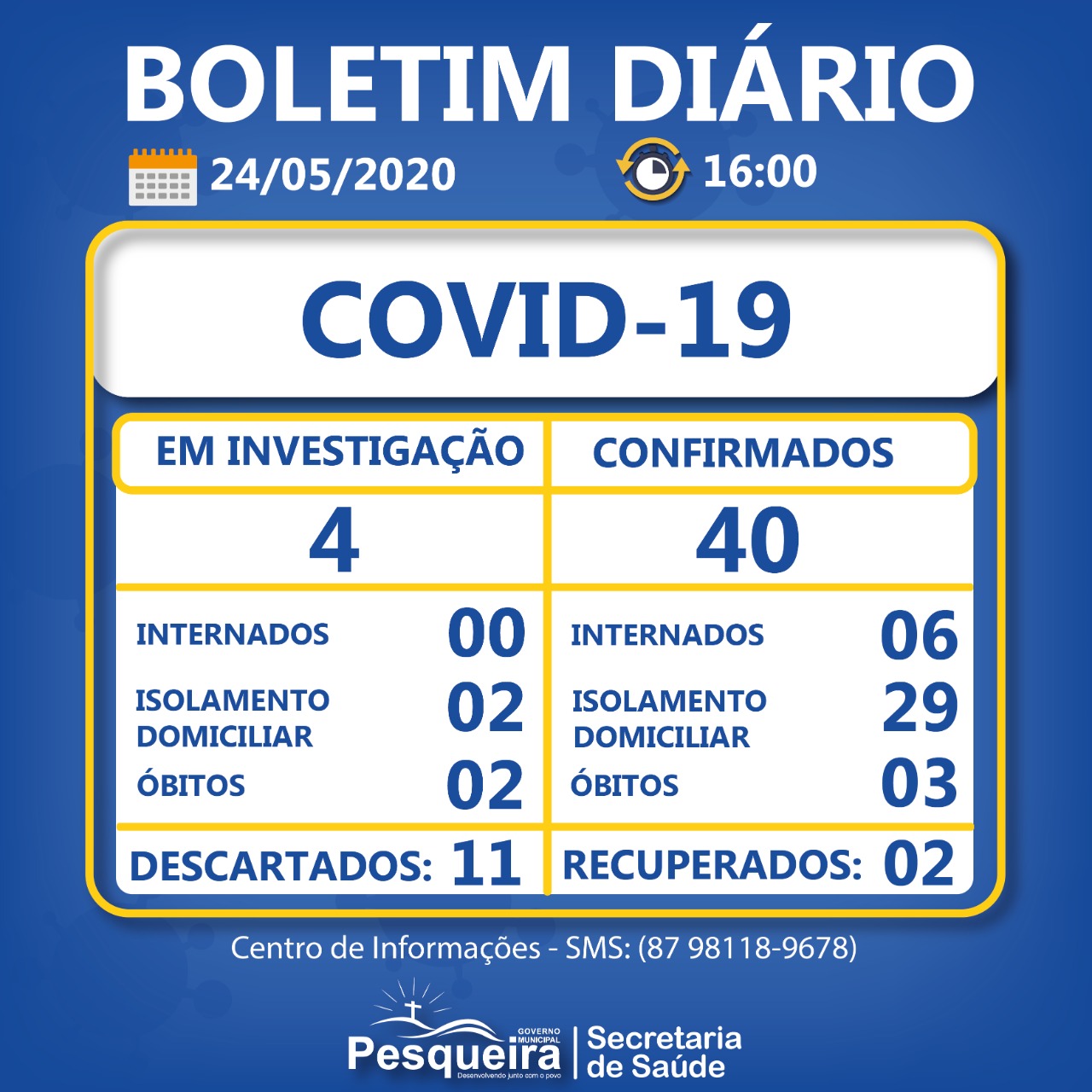 Já em investigação nós temos 4 , sendo que desses são 2 isolamento Domiciliar os em cada, 2 óbitos em investigação e 11 descartados.