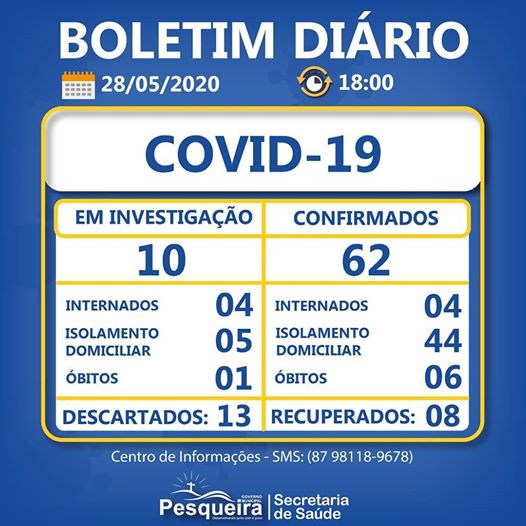 Temos também: 62 casos confirmados; 04 internados; 44 em isolamento domiciliar; 06 óbitos confirmados e 08 casos recuperados.