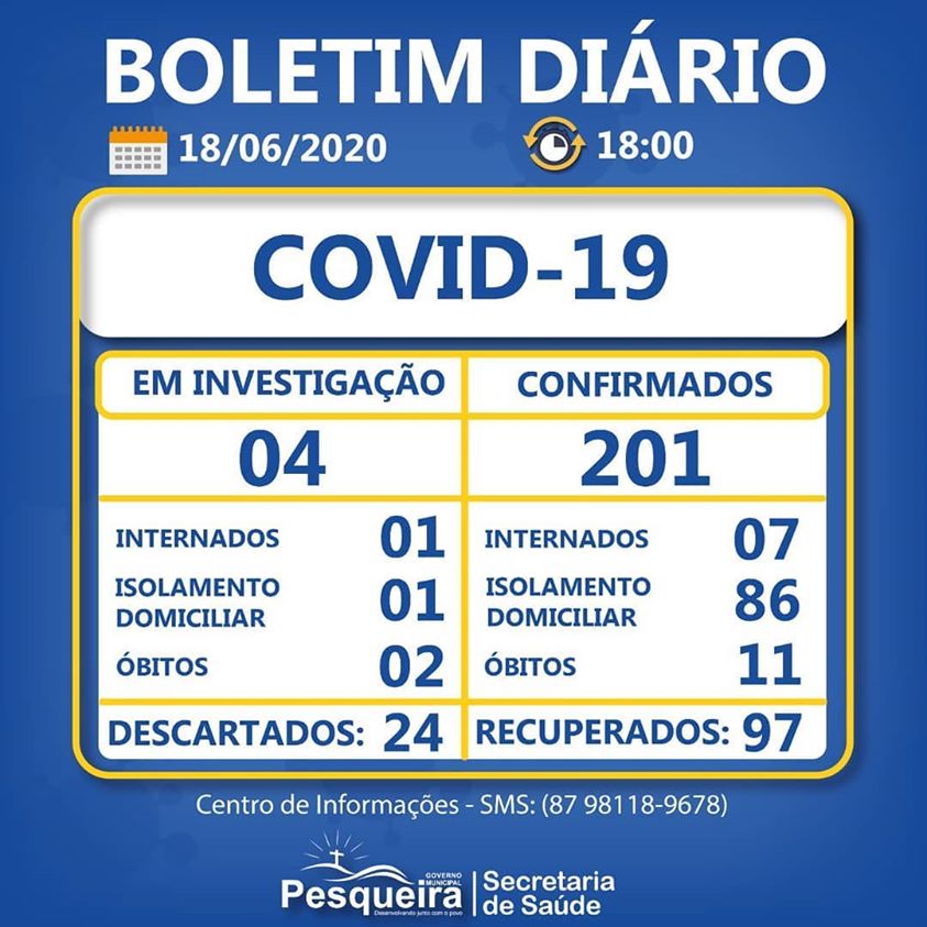 Recebemos de um laboratório particular o resultado positivo de um teste. O paciente está bem e segue em isolamento domiciliar. Ontem tivemos Nove casos positivos em Pesqueira. Todos paciente estão bem e seguem em isolamento domiciliar.