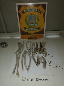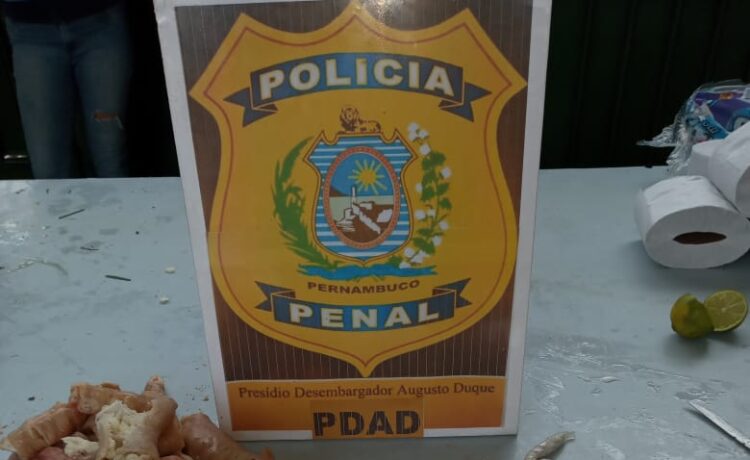 Policiais Penais do Presídio Desembargador Augusto Duque em Pesqueira vem desenvolvendo um trabalho excelente de coibir a entrada de drogas naquela unidade prisional e mais uma vez hoje Por volta das 16:30h ao fazerem revistas nos alimentos a serem entregues aos Ppls do pavilhão “B” foi detectado nos pertences de um deles, diversos involucros escondidos em vísceras animal (tripa) que continham a substância conhecida por maconha, e que ao ser pesadas apresentaram um total de 201gramas.