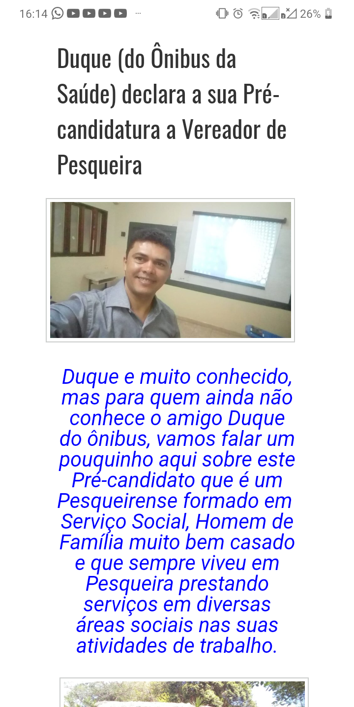 Assim o jovem Duque que sempre esteve atento e dedicado às necessidades da educação, da geração de empregos, da saúde pública e da infraestrutura desta cidade em que vive e onde formou a sua amada família pretende contribuir. Para este fim Duque está dando este primeiro passo, o de lançar o seu nome como pré-candidato em suas redes sociais. Sabendo desta novidade, tomamos a iniciativa de apresentá-la aqui, em nossa Página, e de parabenizá-lo pela coragem de participar desta Eleição Municipal. Parabéns e sucesso, nesta nova caminhada, Duque!