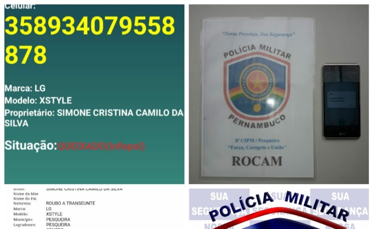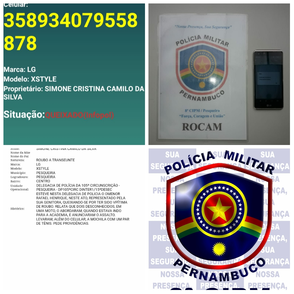 Nesta data, 01 AGO 2020, por volta das 09:30, a equipe da ROCAM da 8ª CIPM, durante a realização da Operação Abordagem no bairro Vila Anápolis, município de Pesqueira, deparou-se com a pessoa em atitude suspeita. Foi procedida a competente abordagem para identificá-la, o que foi feito e não foi encontrado nenhuma restrição em seu nome. Em seguida, os policiais militares consultaram, junto ao aplicativo IRC do sistema ALERTA CELULAR, o aparelho celular da imputada, um LG XSTYLE , IMEI 358934079558878, sendo constatado uma restrição por roubo.
