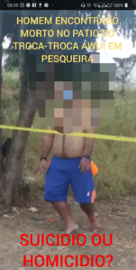 O corpo em tela era do segurança particilar conhecido com JHON SOUZA que aparetava ter se suicidado por enforcamento com uma corda em volta do seu pescoço em uma arvore que tem no local