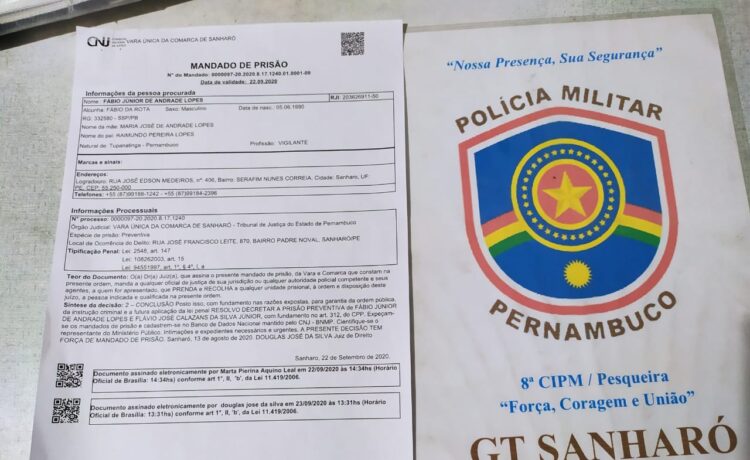 Nesta data 24 SET 2020 por volta das 16:30, *a GT de Sanharó,* durante a realização da Operação Duas Rodas, recebeu informações que teria um mando de prisão em desfavor de F.J.A. De imediato os policiais militares seguiram ao local da denúncia onde o imputado em tela foi localizado.