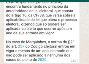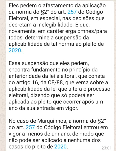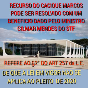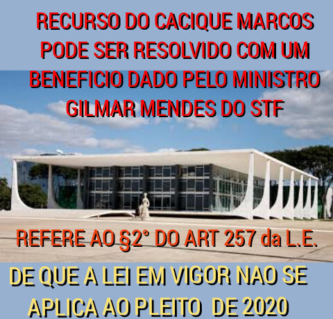 Se a corte Superior Eleitoral acatar o entendimento do Ministro do STF Gilmar Mendes dando aceitação ao pedido que suspende orientação do TSE sobre efeito suspensivo de recurso eleitoral pela “Erga Omnes” dará o provimento de arquivamento do processo em curso anulando- se os autos e assim deferindo a candidatura como eleito e homologado oficialmente o Cacique Marcos como prefeito do Município sendo empossado em primeiro de Janeiro de 2021