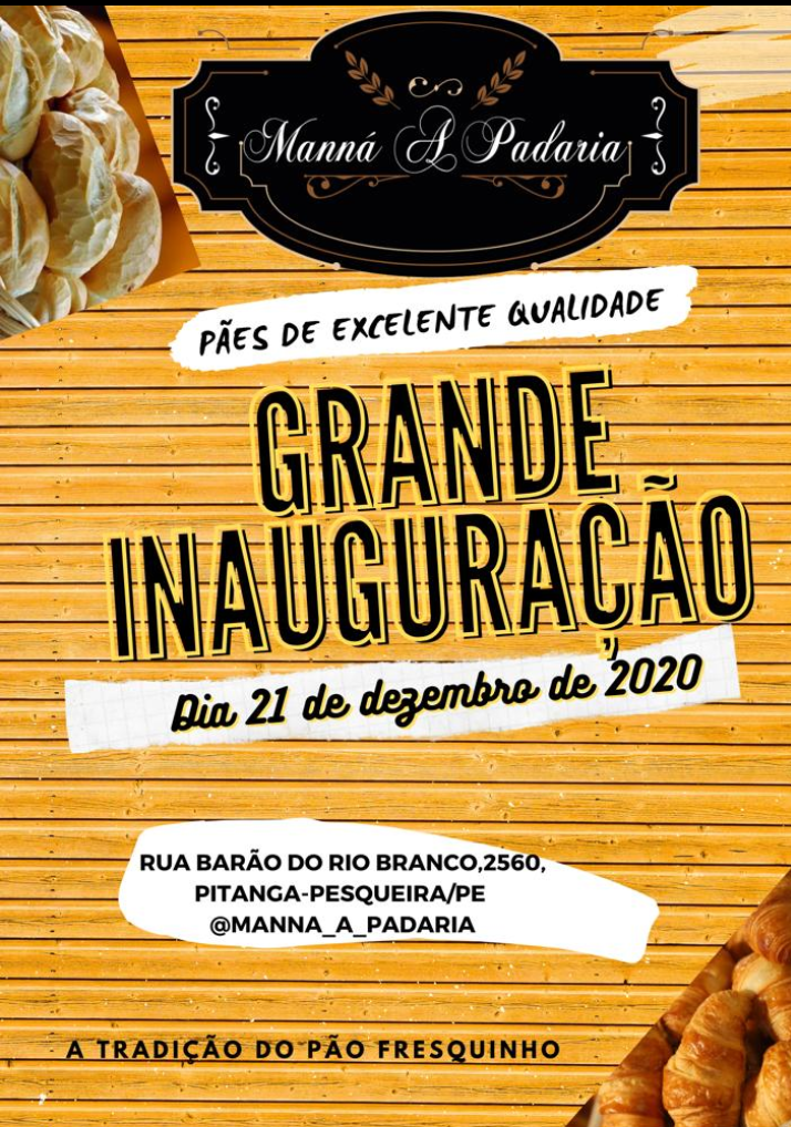 Venha prestigiar a nossa inauguração nestá seguda-feira 21 de Dezembro, é com grande satisfação que trouxemos tudo que faltava no seu bairro, não deixe de vir conhecer o nosso espaço e garantir o seu pão quentinho, tudo feito com muito carinho por quem sabe, tudo feito especialmente para você !