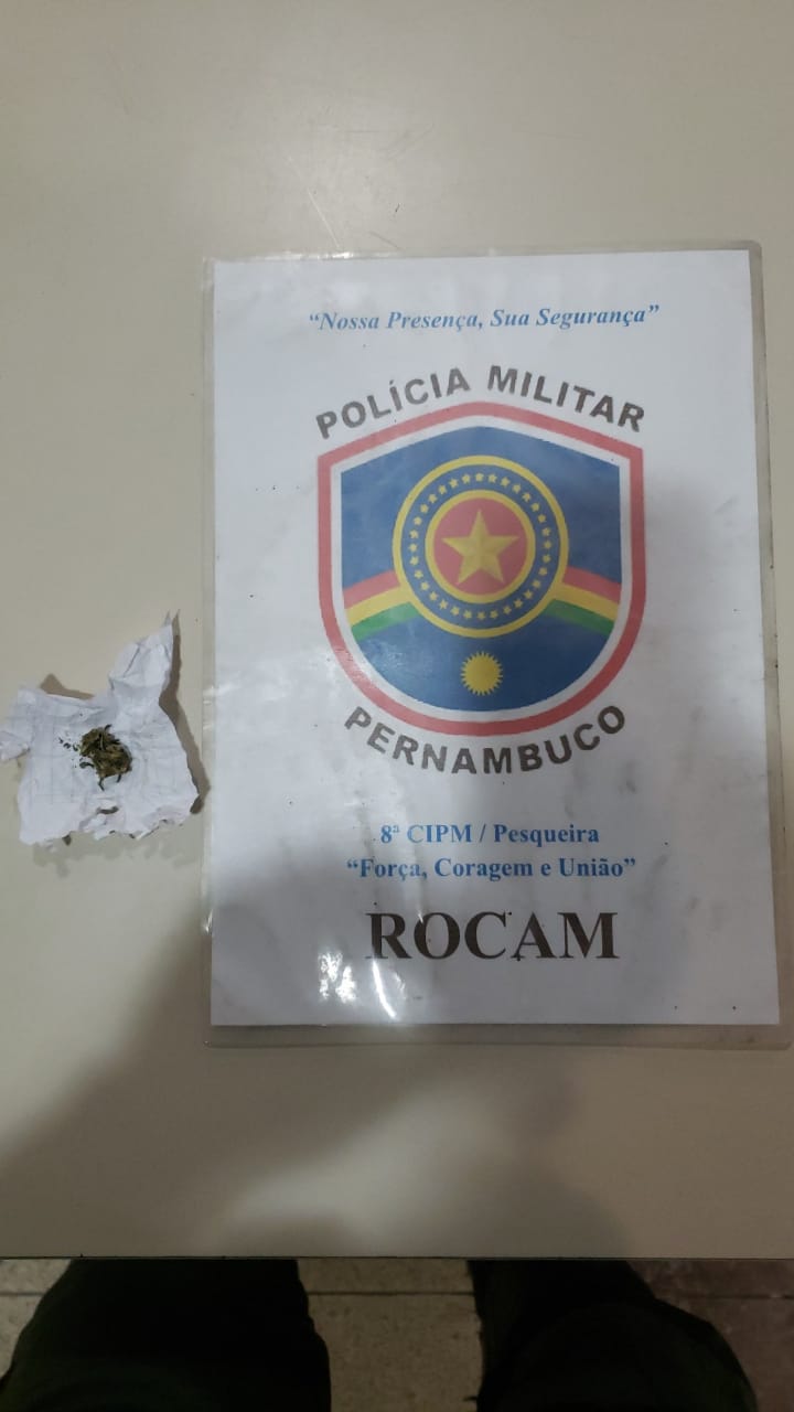 Nessa mesma situação os policiais notaram a atitude suspeita do imputado C.A.S., e de pronto foi procedida a competente abordagem policial, sendo encontrado no bolso do short do imputado, uma (01) porção de substância conhecida popularmente como maconha, pesando aproximadamente 03g