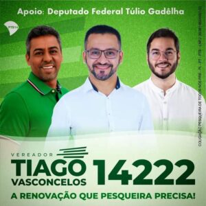 Tiago Vasconcelos é formado em letras e professor efetivo do estado de Pernambuco. Possui várias especializações, inclusive em gestão pública. Já trabalhou com a administração pública de Pesqueira e conhece muito bem o município onde foi candidato a vereador pelo PTB no grupo do Cacique Marcos . Onde militava com muita força e dedicação ao grupo. Tiago é amigo e ligado politicamente ao Deputado Federal Tulio Gadelha com quem tem ajudado nossa Pesqueira com emendas parlamentares.