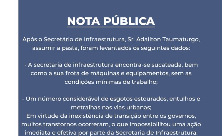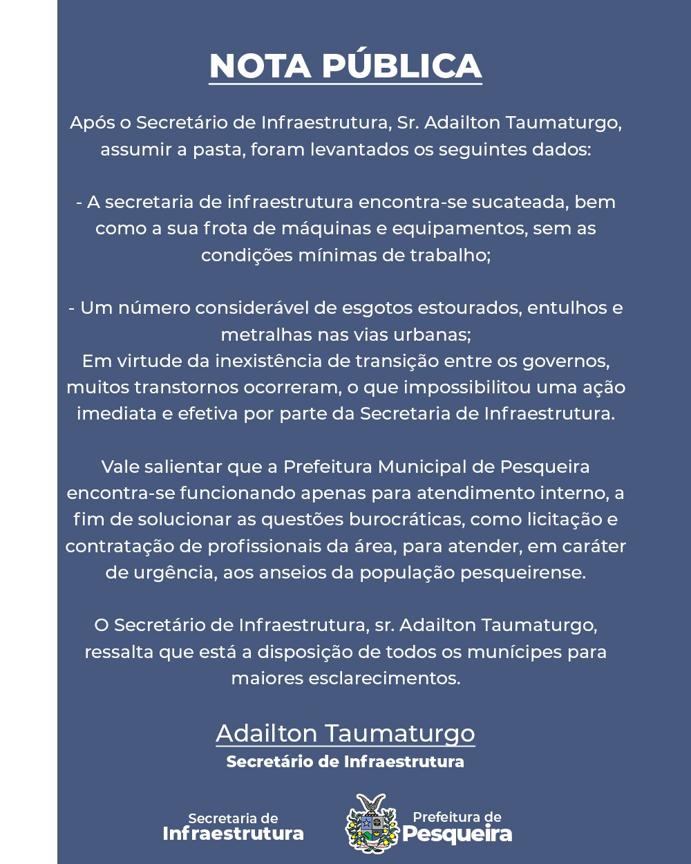 o Secretário de Infraestrutura, sr. Adailton Taumaturgo, ressalta que está a disposição de todos os munícipes para maiores esclarecimentos.