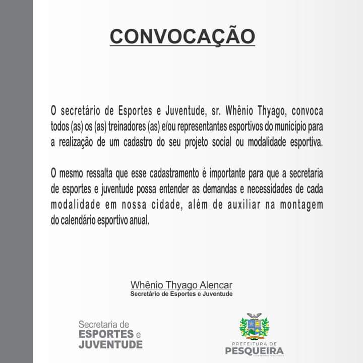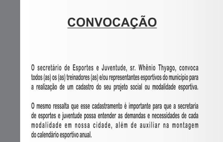 O secretário de esportes e juventude, sr. Whênio Thyago, convoca todos (as) vocês para uma conversa a fim de entender as demandas de cada esporte e realizar cadastramento que auxiliará na montagem do calendário esportivo anual.