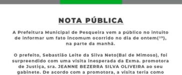 NOTA PÚBLICA A Prefeitura Municipal de Pesqueira vem a público no intuito de informar um fato incomum ocorrido no dia de ontem(19), na parte da manhã. O prefeito, Sebastião Leite da Silva Neto (Bal de Mimoso), foi surpreendido com uma visita inesperada da Exma. promotora de Justiça, sra. JEANNE BEZERRA SILVA OLIVEIRA ao seu gabinete. … Continue a ler A Prefeitura Municipal de Pesqueira vem a público no intuito de informar um fato incomum ocorrido no dia de ontem(19), na parte da manhã.