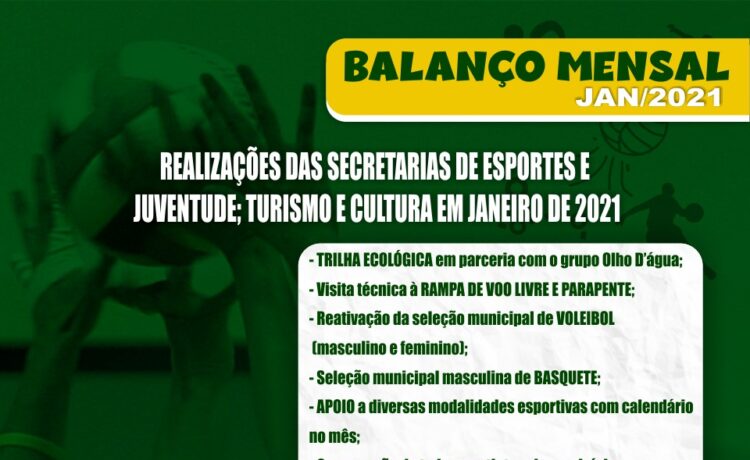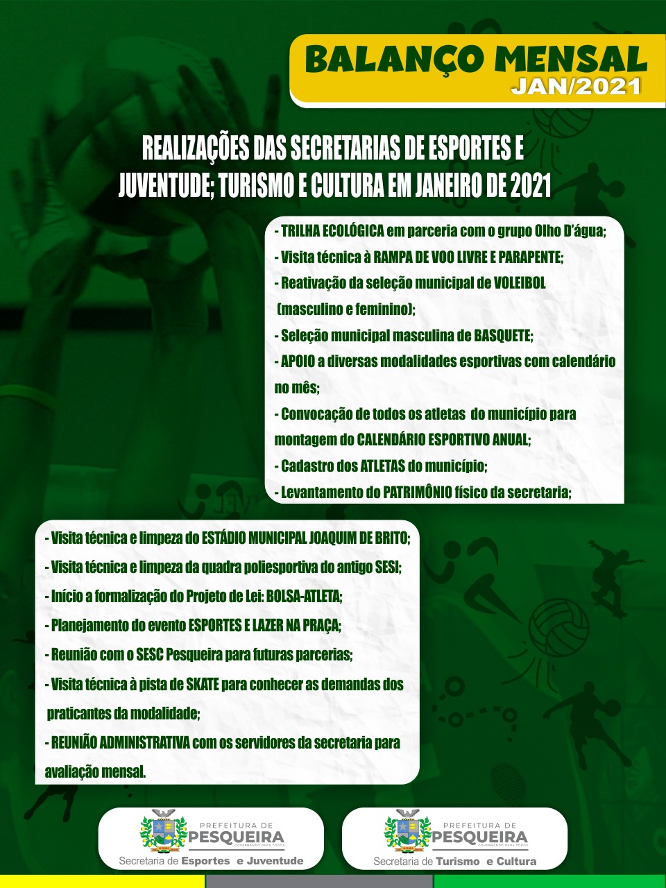 O primeiro mês foi de muito trabalho nas Secretarias de Esportes e Juventude; e Turismo e Cultura. O balanço mensal é uma forma de informar aos nossos cidadãos o que está sendo realizado nas secretarias supracitadas da Prefeitura Municipal de Pesqueira. Agora, o cidadão pode avaliar por si mesmo os serviços prestados, além de tecer as suas opiniões para que possamos atender, da melhor forma possível, aos anseios de todos a fim de que Pesqueira se torne uma cidade melhor.