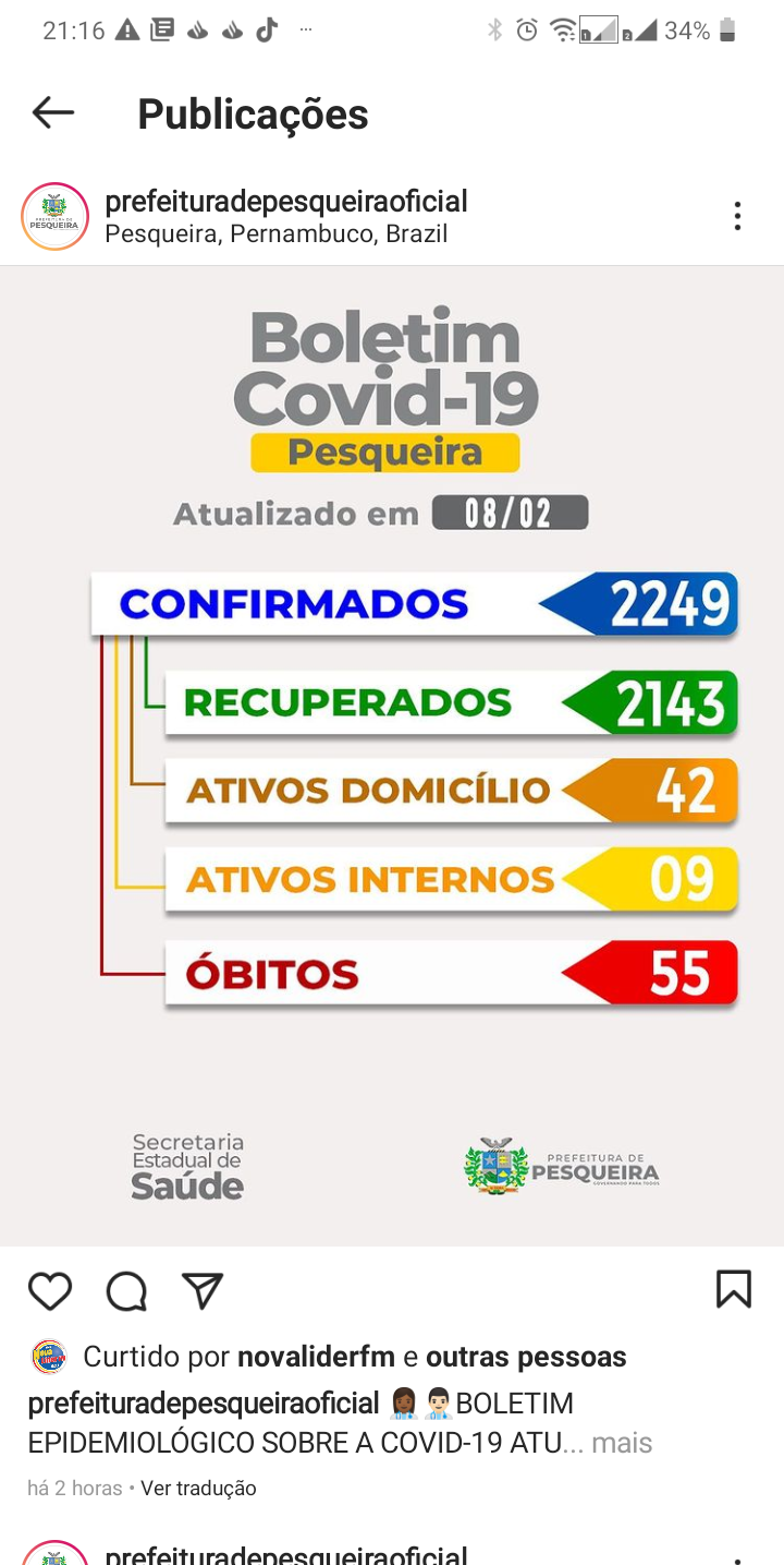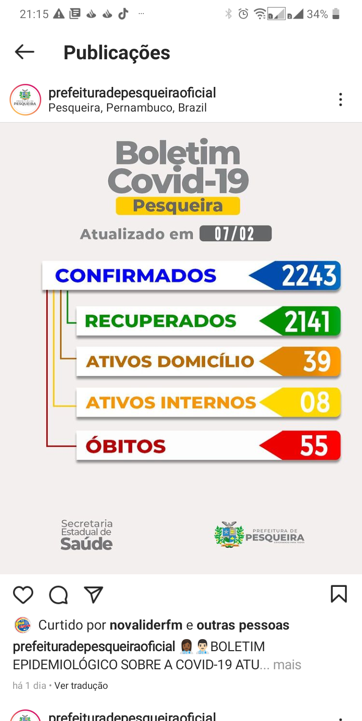 O que nos preocupa sãos os casos de óbitos que ja chegamos ao total de 55 Pessoas mortas. Este ano já temos 4 quatro vidas perdidas a mais nesses 36 primeiros dias do ano. ( esses dados são contabilizados dos que morrem aqui e tambem Pesqueirenses que morrem fora daqui) muita gente perdendo a vida ainda por conta desse vírus. Misericórdia Jesus.