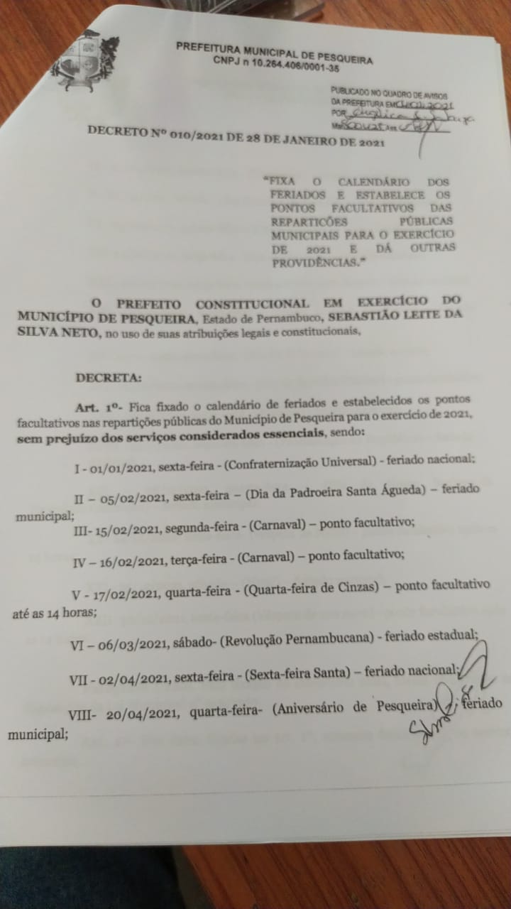 facultativos nas repartições públicas do Município de Pesqueira para o exercício de 2021,