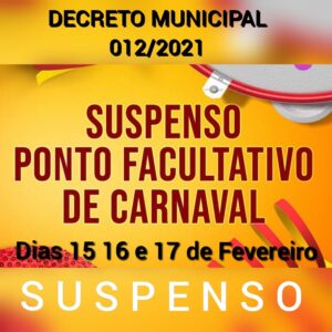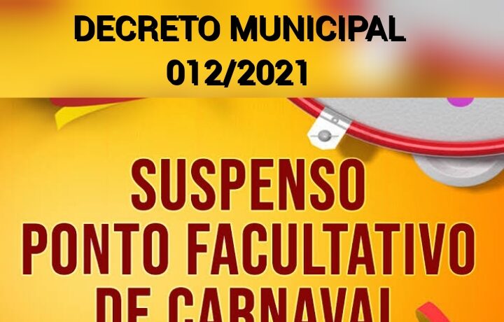 DECRETO Nº 012/2021 DE 04 DE FEVEREIRO DE 2021 . SUSPENDE 0 PONTO FACULTATIVO PARA FESTEJOS CARNAVALESCOS E DÁ OUTRAS