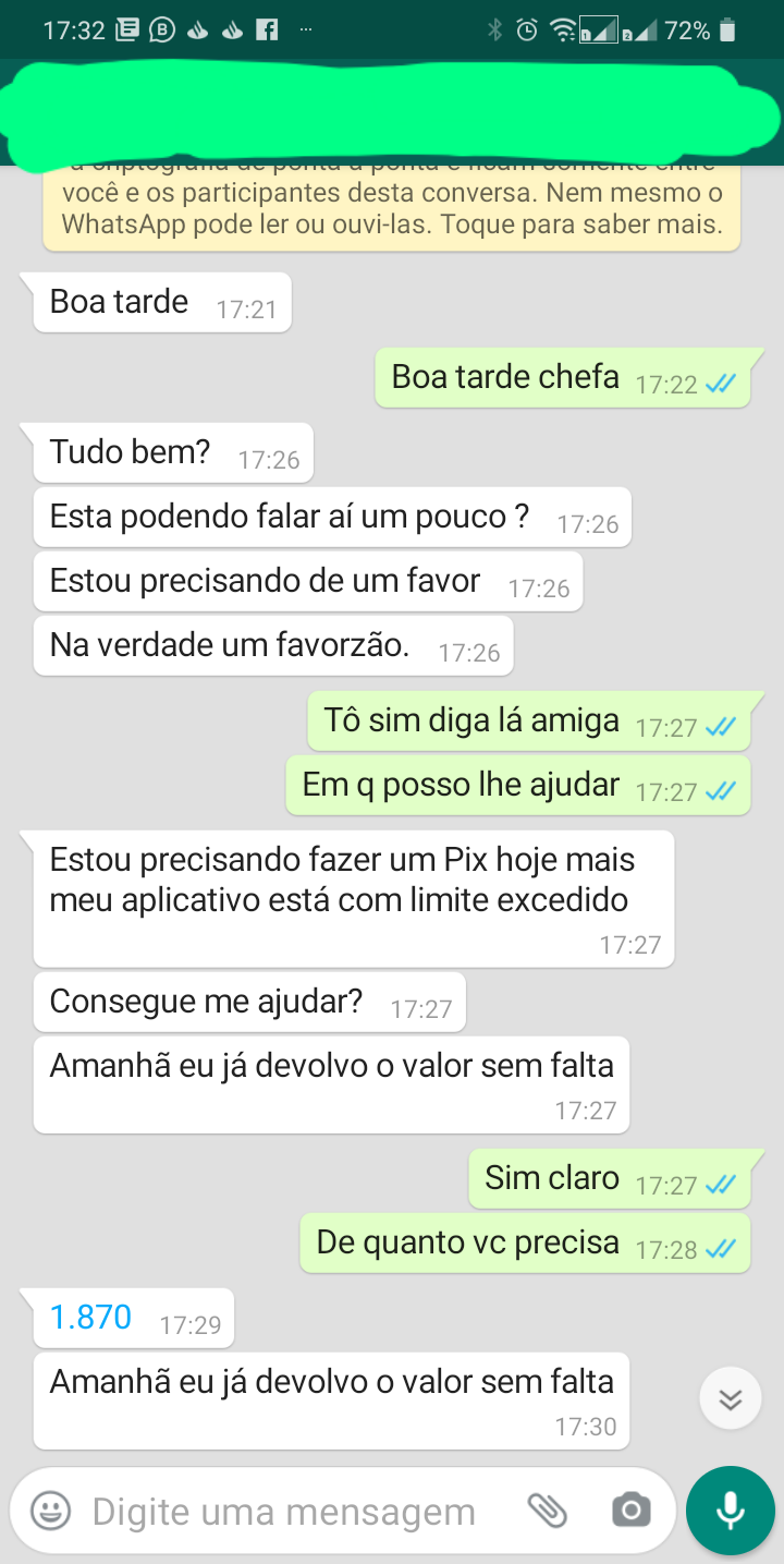 Veja abaixo uma das conversas que um dos malas usou com uma vitima que percebeu que era um golpe pois tinha sido avisada pela pessoa que teve seu Whatsapp clonado avisou a todos os amigos.