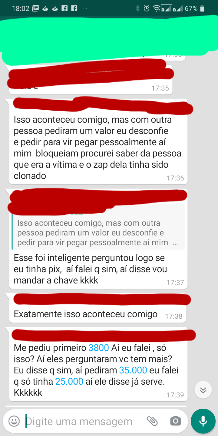 Tomamos conhecimentos hoje terça feira dia 16.02 de que quatro pessoas daqui da nossa cidade tiveram seus Whatsapp clonados e de imediato os bandidos começaram a usar os mesmos para extorquir os amigos que tinham seus nomes e números na lista dos Whatsapp dessas quatro pessoas