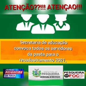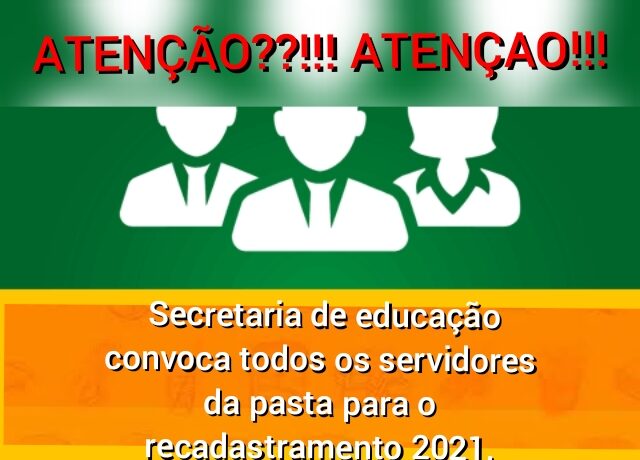 A Secretaria de educação convoca todos os servidores para o recadastramento 2021, de 18 a 26 de fevereiro, das 8h às 13h, no auditório da secretaria. Os servidores devem levar os originais e cópias do RG, CPF, PIS/PASEP, Comprovante de residência, termo de posse, Portaria de titulação, declaração de localização, convênio de permuta ou cedência, último contracheque. Fique atento à ordem do recadastramento pela inicial do nome: