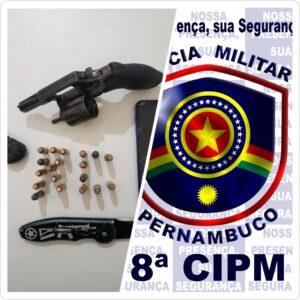 Com o piloto não foi encontrado nada de ilícito, porém, ao realizar revista no garupa, foi localizado na cintura do imputado o qual possui passagem pelo sistema prisional pelo crime de tentativa de homicídio, *um (01) revólver marca Taurus, n° BJ27751, municiado com cinco (05) munições CBC intactas de mesmo calibre e (01) canivete marca MENKS*.