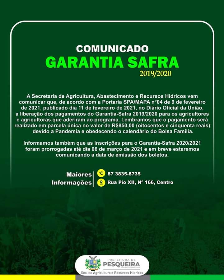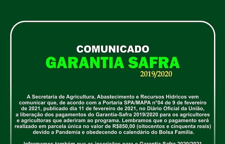 ??‍?Atenção, Agricultores! A Secretaria de Agricultura, Abastecimento e recursos hídricos divulgou o comunicado referente ao pagamento do Garantia Safra 19/20.