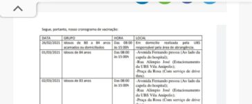 No 24 de fevereiro de 2021 o estado de Pernambuco recebeu mais de 82 mil doses de vacinas contra a covid-19, da farmacêutica AstraZeneca e da Oxford. Esse novo lote será para vacinação dos idosos entre 80 e 84 anos de todos os municípios do estado. Assim O município de Pesqueira, diante do levantamento do … Continue a ler A secretaria de saúde do Município de Pesqueira divulga calendário de vacinação para idosos de 80 à 84 anosde idade.