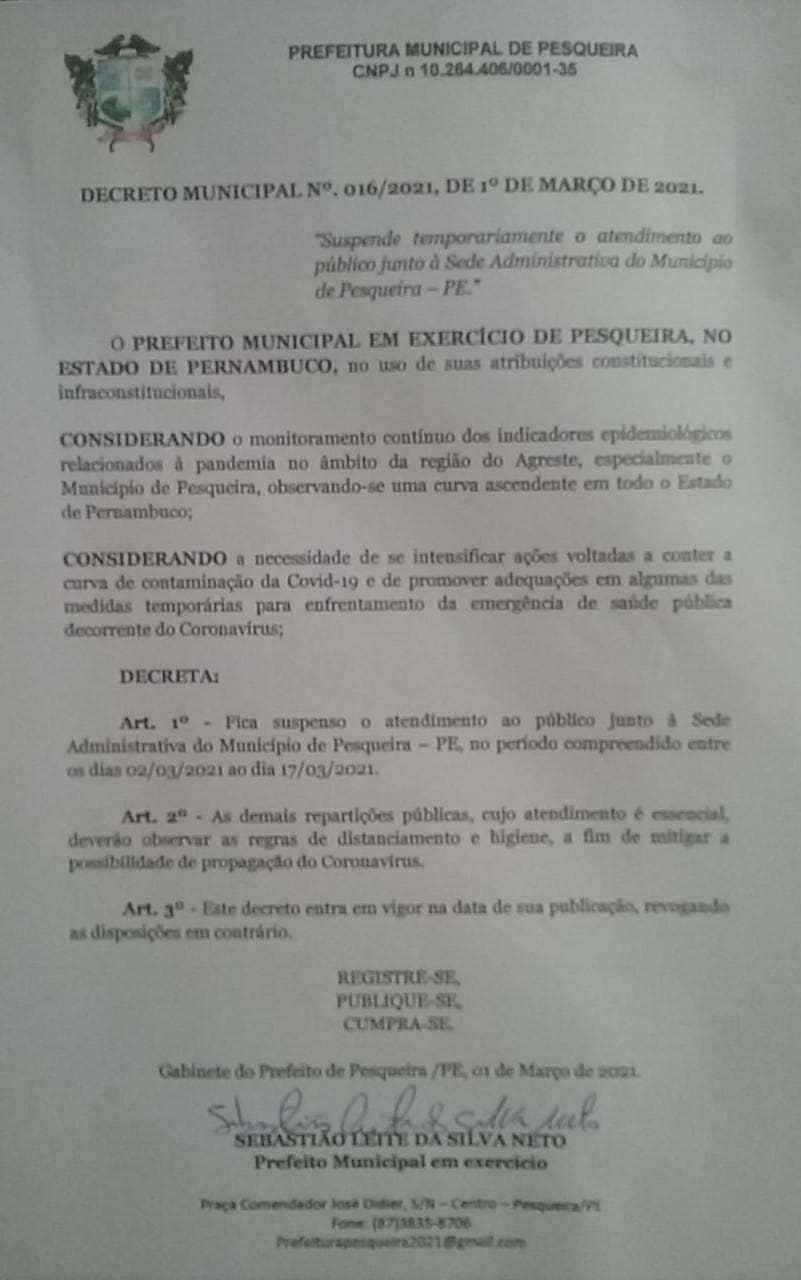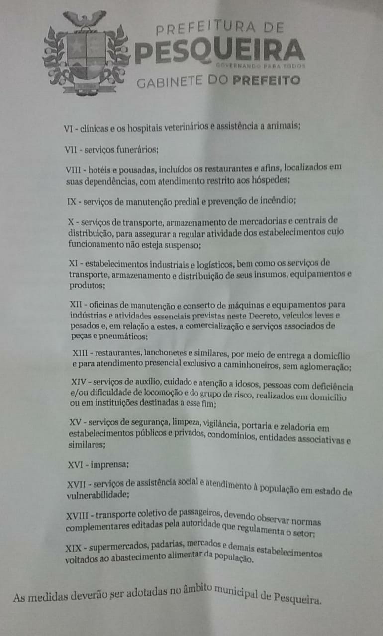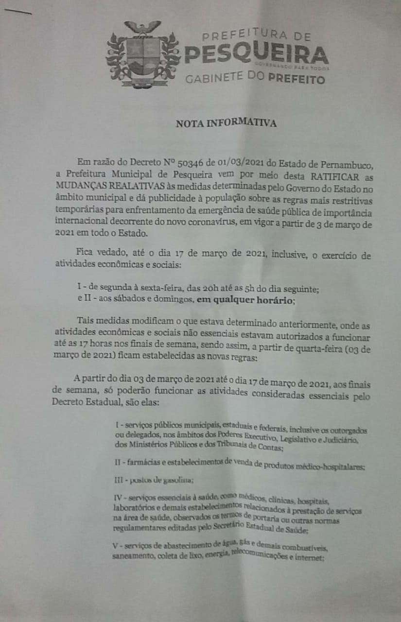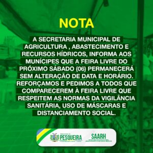“A Secretaria de Agricultura e Recursos Hídrico informa aos cidadãos pesqueirenses que a feira livre acontecerá normalmente no próximo Sábado (06/03). Porém, o uso da máscara, o distanciamento social e as normas da vigilância sanitária devem ser respeitados por todos para evitarmos a proliferação da Covid-19 em nossa cidade.” diz a postagem.