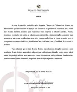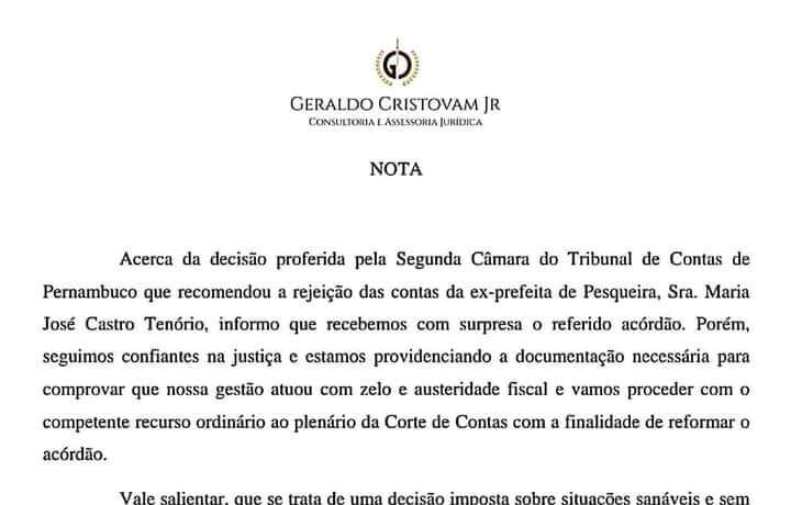 Pesqueira: A ex-prefeita Maria José Castro Tenório, pelo seu advogado, emite Nota de Esclarecimento sobre sua condição política e administrativa.
