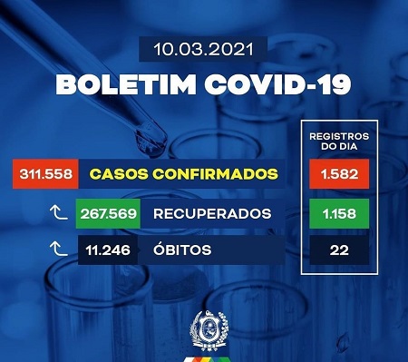 Também foram confirmados laboratorialmente 22 novos óbitos, ocorridos entre os dias 05/02/2021 e 08/03/2021. Com isso, o Estado totaliza 11.246 mortes pela doença.
