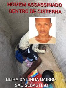 Uma viatura da polícia militar de nossa cidade foi acionada pela central de operações com a informação que no endereço acima citado encontrava se um cadáver dentro de uma cisterna vazia, Ao chegar no local e constatar foi avistado manchas de sangue, foi informado por familiares que o mesmo já passou pelo presídio de Arco Verde respondendo por tráfico de entorpecentes ,a vítima foi alvejada por um 01 tiro de arma de fogo