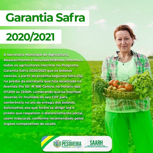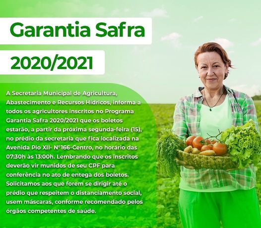 A Secretaria Municipal de Agricultura, Abastecimento e Recursos Hídricos, informa a todos (as) agricultores (as) inscritos no Programa Garantia Safra 2020/2021 que os boletos estarão, a partir da próxima segunda-feira (15), no prédio da secretaria que fica localizada na Avenida Pio XII- N°166-Centro, no horário das 07:30 às 13:00h. Lembrando que os inscritos deverão vir munidos de seu CPF para conferência no ato de entega dos boletos.
