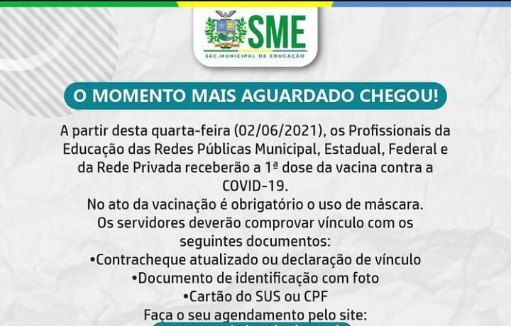 Boa notícia! A vacina para os professores já tem data para começar no nosso município: 02 de junho. E você já pode fazer o agendamento no site.