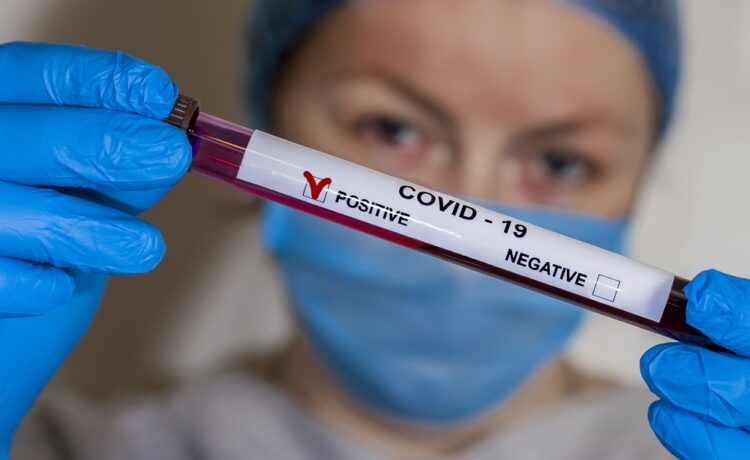 Conceptual photo – testing for coronavirus: in the hand there is a test tube with a patient s blood sample, which gave a positive result for coronavirus COVID-19.