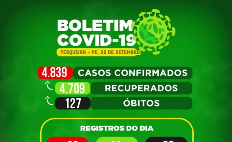 Pode ser uma imagem de texto que diz "BOLETIM COVID-19 PESQUEIRA PE, 26 DE SETEMBRO 4.839 CASOS CONFIRMADOS 4.709 RECUPERADOS 127 ÓBITOS REGISTROS DO DIA 00 CONFIRMADOS 00 RECUPERADOS 00 ÓBITOS 02 01 ATIVOS DOMICÍLIO ATIVOSNTERNOS ATIVOS INTERNOS PREFETURA PESQUEIRA UD SMS MUNICIPAL DESAUDE"