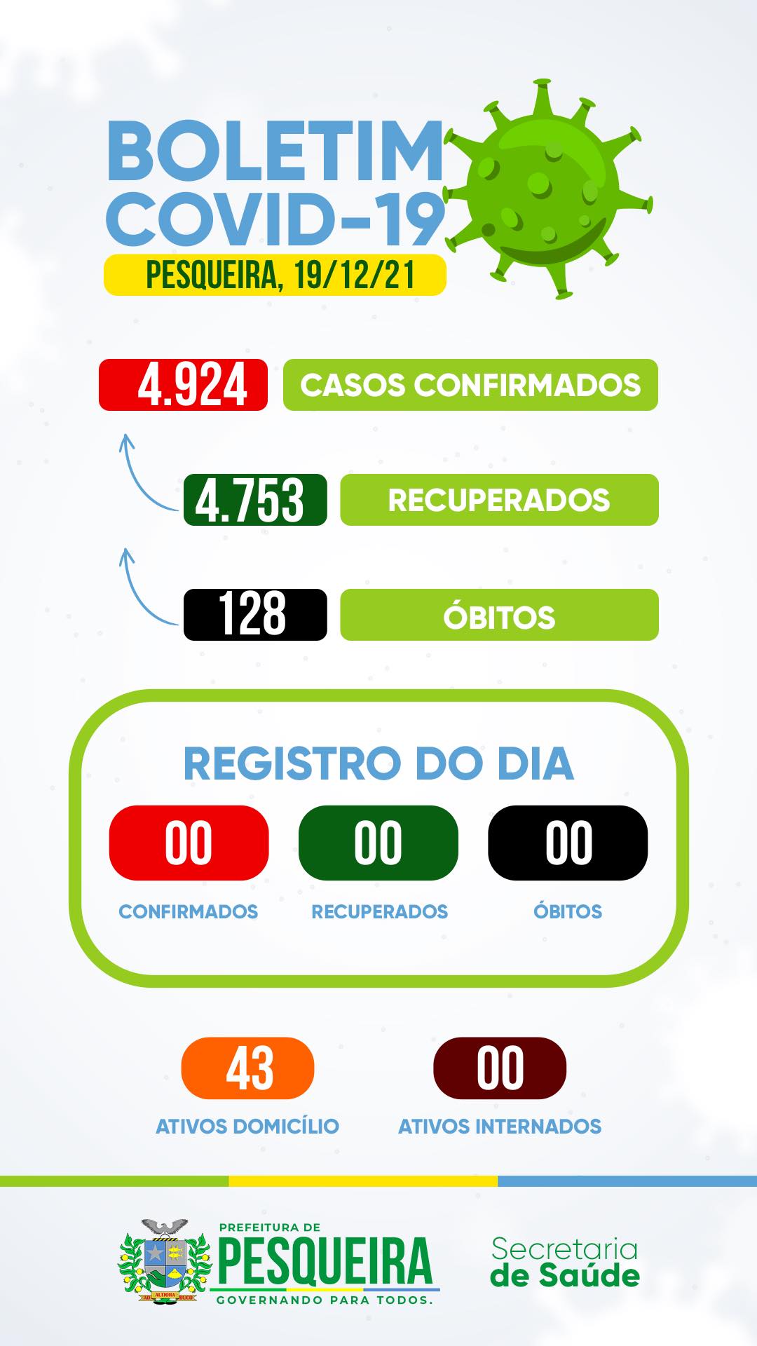 A Secretaria de Saúde informa aos munícipes o boletim da Covid-19 atualizado em 19 de dezembro de 2021.