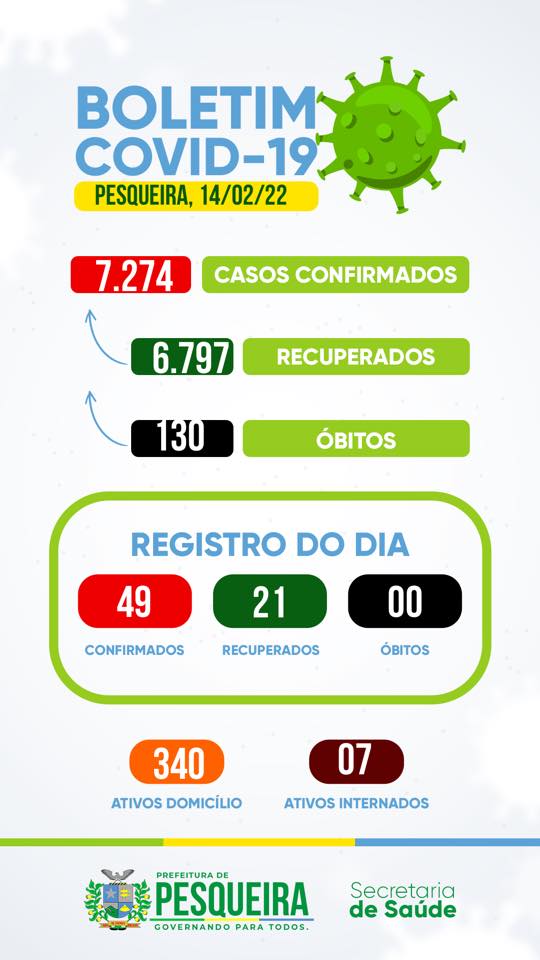 A Secretaria de Saúde informa aos munícipes o boletim da Covid-19 atualizado em 14 de fevereiro de 2022.