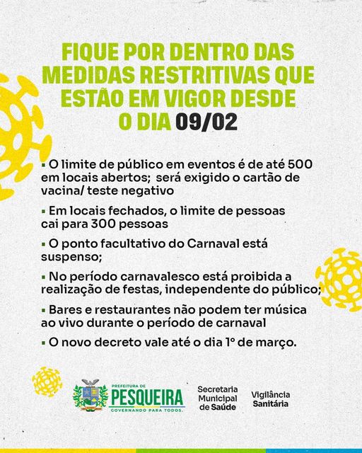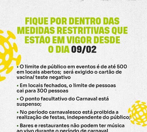 – O limite de público em eventos é de até 500 em locais abertos; será exigido o cartão de vacina/ teste negativo;