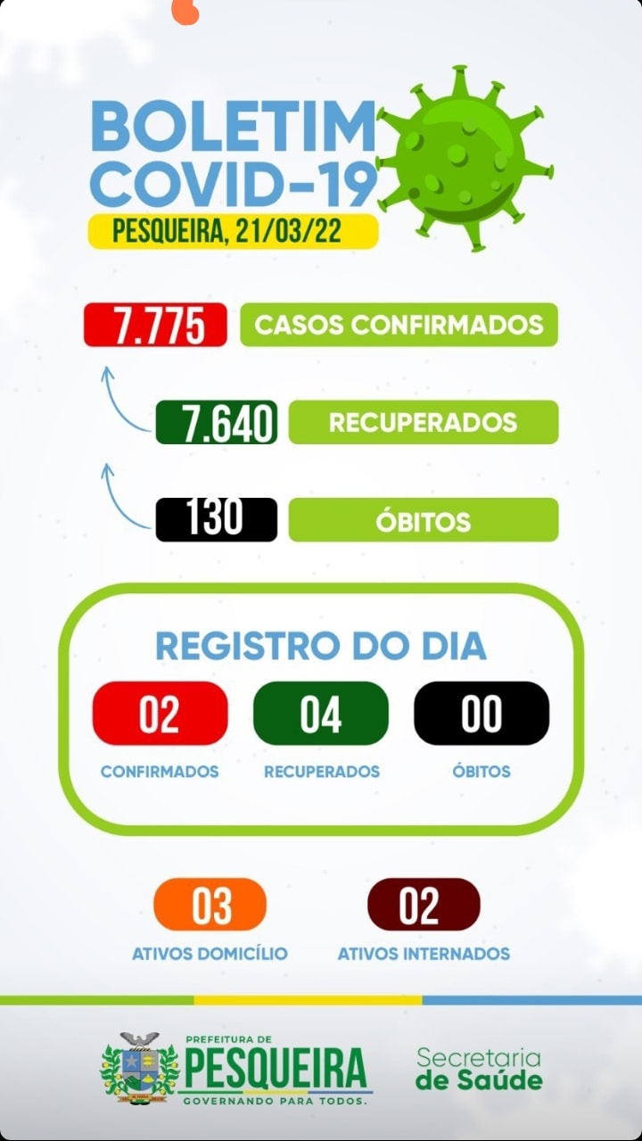 A Secretaria de Saúde informa aos munícipes o boletim da Covid-19 atualizado em 21 de março de 2022.
