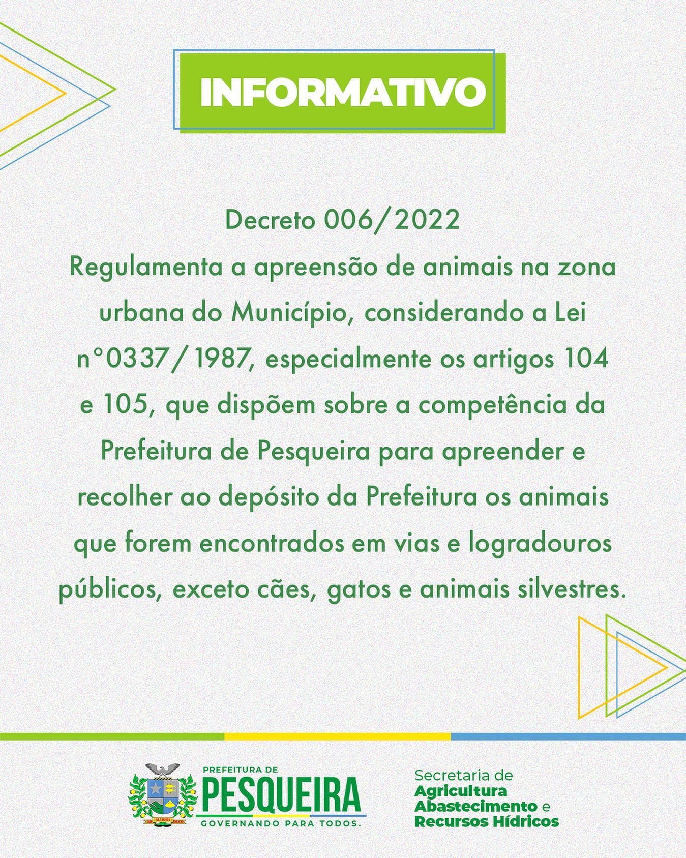 Regulamenta a apreensão de animais na zona urbana do Município, considerando a Lei n°0337/1987, especialmente os artigos 104 e 105, que dispõem sobre a competência da Prefeitura de Pesqueira para apreender e recolher ao depósito da Prefeitura os animais que forem encontrados em vias e logradouros públicos, exceto cães, gatos e animais silvestres.