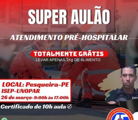 O ISEP/ UNOPAR em parceira com AE CURSOS tem a honra de convidar você de Pesqueira e Região para participar no próximo sábado (26) do 1° Aulão Solidário de Atendimento Pré-Hospitalar (APH). Para participar o candidato deve se dirigir até o prédio do ISEP/Unopar para efetivar sua inscrição, basta levar um 1kg de alimento não perecível que será destinado para famílias carentes.