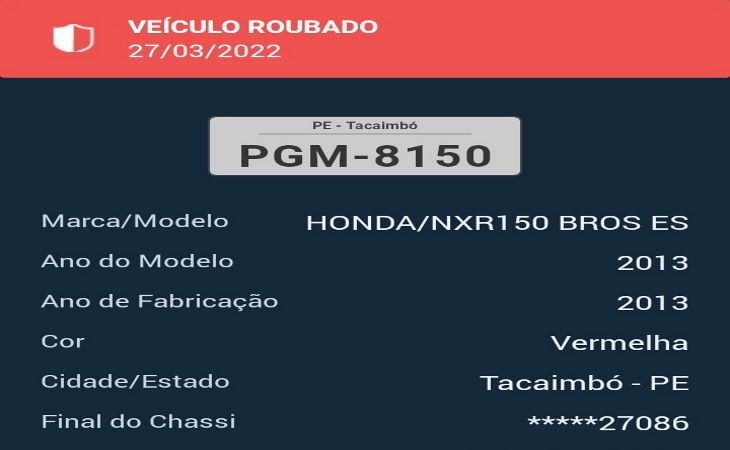 No fim da tarde de domingo, 27, foi roubada uma motocicleta modelo NXR 150 Bros, vermelha, com placa PGM-8150. O assalto ocorreu no centro de Tacaimbó/PE.