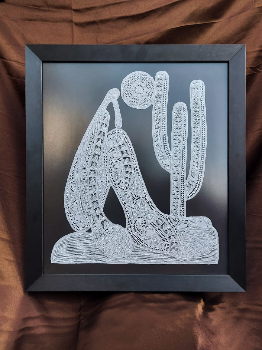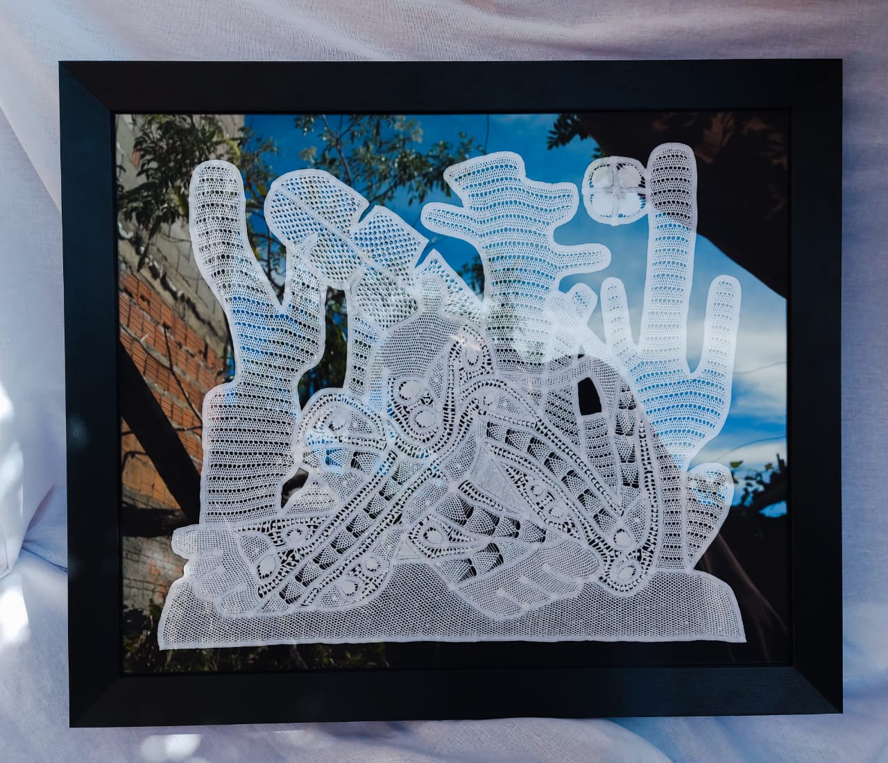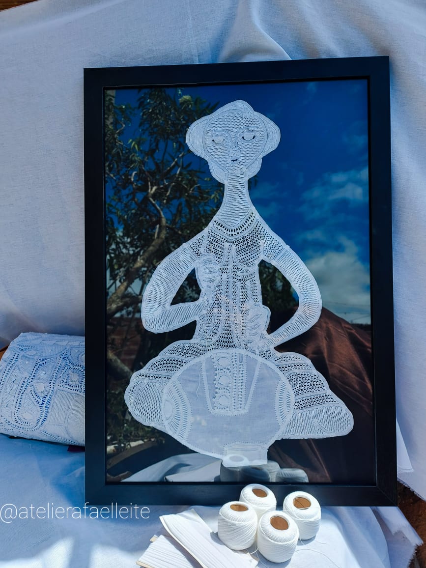 Com o foco voltado para o dia do encerramento do curso, vi alí a oportunidade de trazer um pouco do que já vinha imaginando e surpreender com algo novo e totalmente diferente dos tradicionais, mas nem tudo foi do jeito que eu gostaria. Tive dificuldade com a moldura do meu quadro para a exposição, eu não tinha condições de fazer uma moldura sofisticada, então utilizei da criatividade para produzir minha própria moldura.Tendo isso em vista, já que tinha madeira e um serrote em casa (e diga-se de passagem, não era novo, tive dificuldade em dobro). Em meio a muitas noites em claro, imaginando as melhores formas de desenhos da renda na releitura, nasceu a obra. Com a renda e o acabamento com o tecido de linho montado na moldura o trabalho estaria finalizado, só não imaginava que ali seria apenas o começo da minha vida de artesão. O quadro que eu escolhi para expor foi o “Abaporu” de Tarsila do Amaral, acredito que não fui eu que escolhi o quadro, e sim o quadro que me escolheu. Vi nele tudo o que queria mostrar através da renda; uma obra de arte, a representatividade do Nordeste, da cultura e da tradição em uma mesma obra.