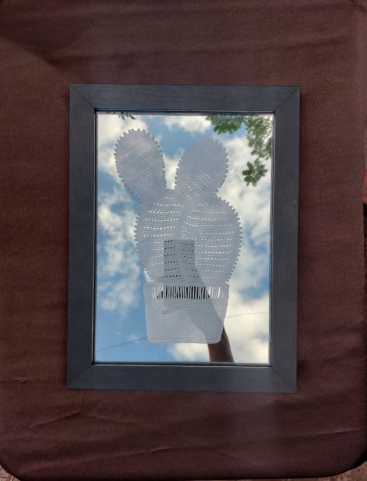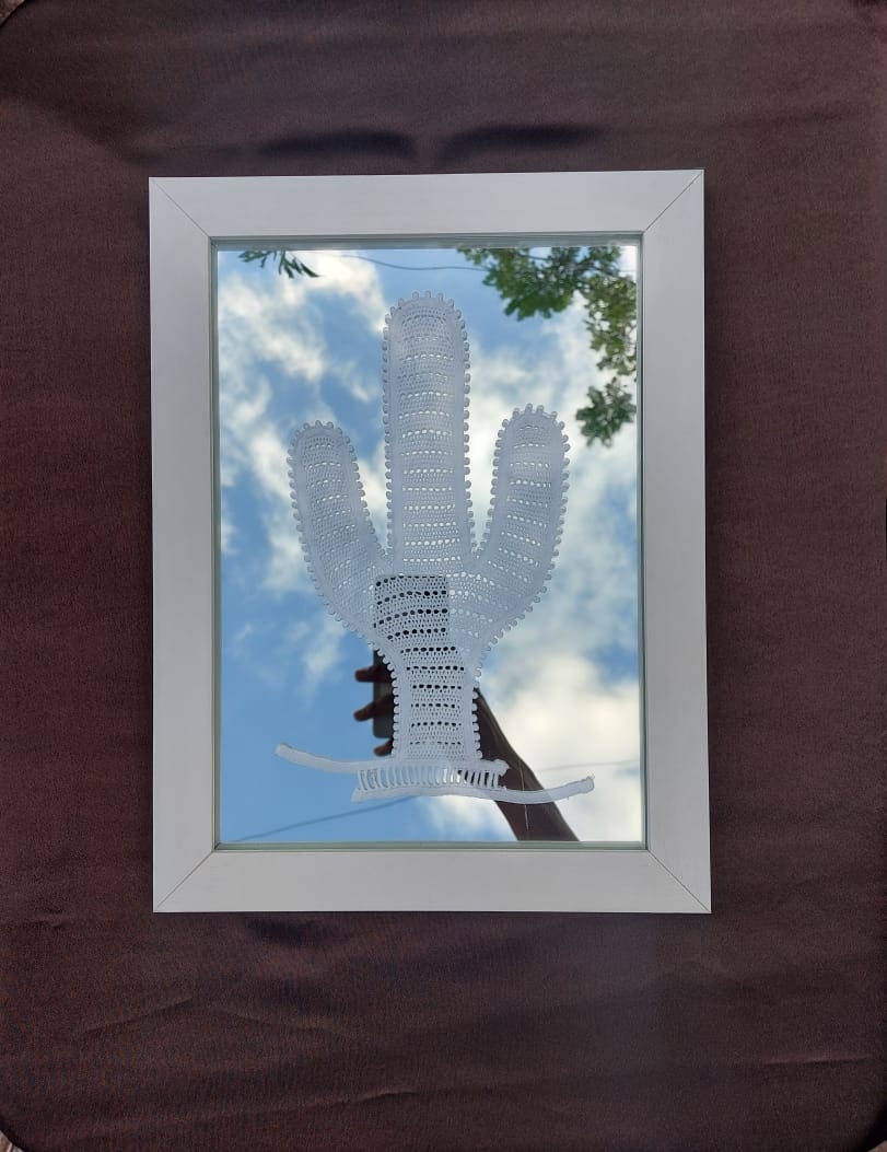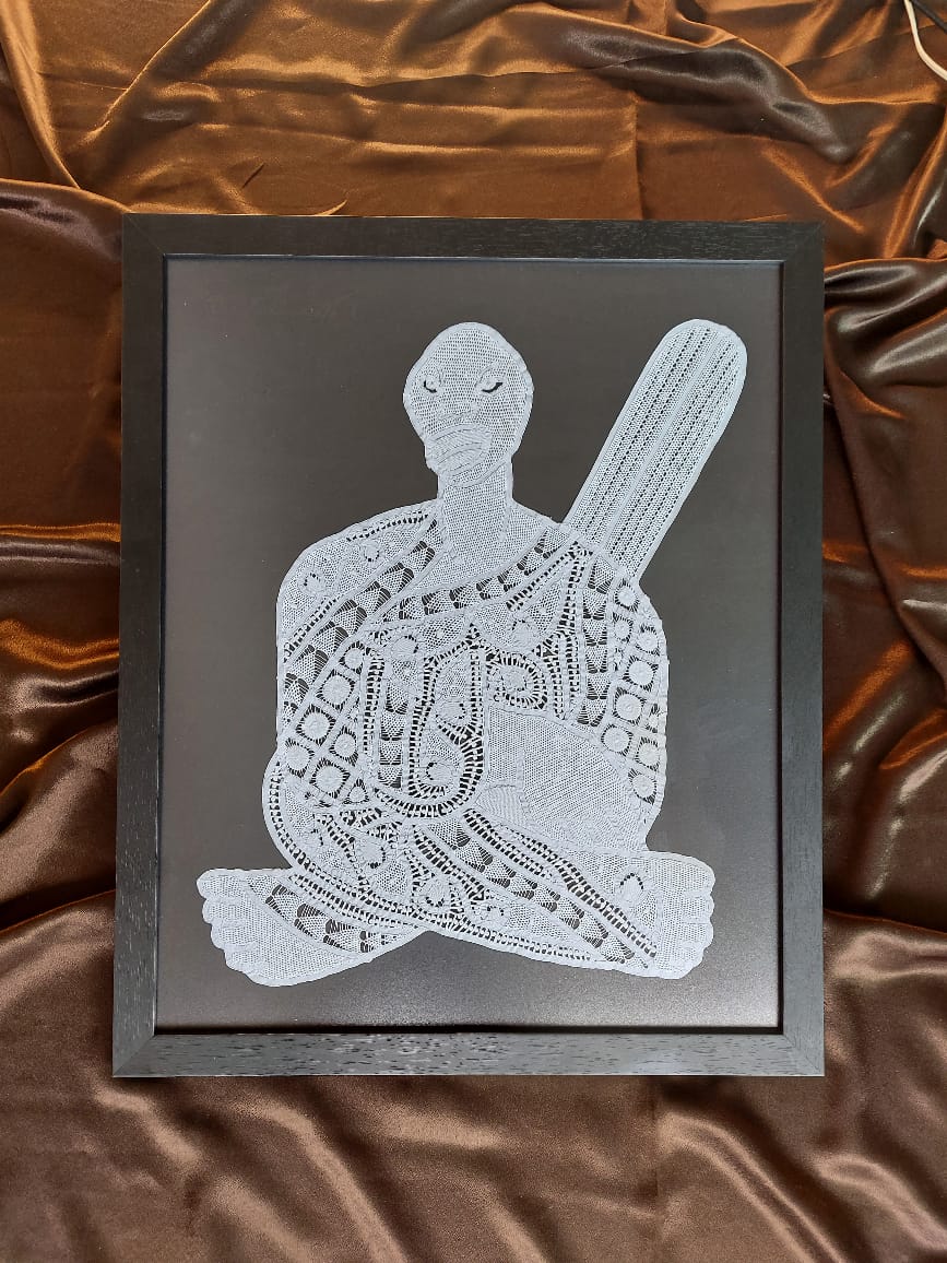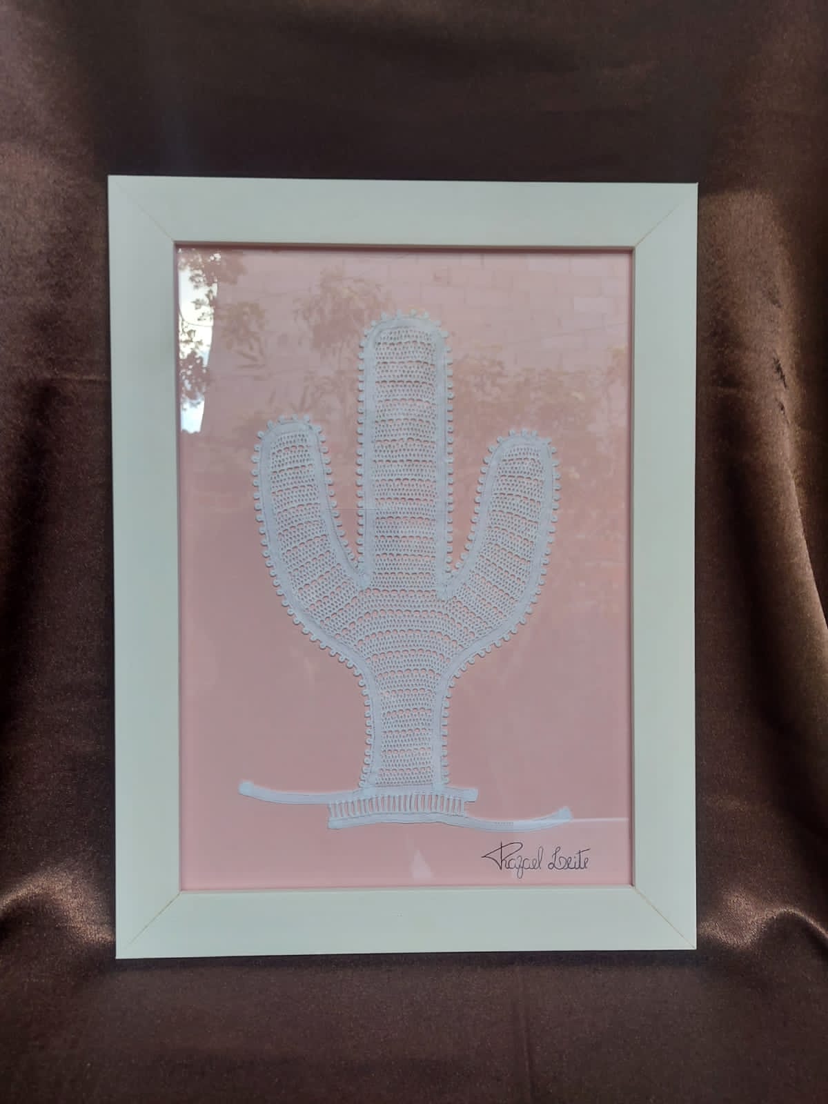 Com o foco voltado para o dia do encerramento do curso, vi alí a oportunidade de trazer um pouco do que já vinha imaginando e surpreender com algo novo e totalmente diferente dos tradicionais, mas nem tudo foi do jeito que eu gostaria. Tive dificuldade com a moldura do meu quadro para a exposição, eu não tinha condições de fazer uma moldura sofisticada, então utilizei da criatividade para produzir minha própria moldura.Tendo isso em vista, já que tinha madeira e um serrote em casa (e diga-se de passagem, não era novo, tive dificuldade em dobro). Em meio a muitas noites em claro, imaginando as melhores formas de desenhos da renda na releitura, nasceu a obra. Com a renda e o acabamento com o tecido de linho montado na moldura o trabalho estaria finalizado, só não imaginava que ali seria apenas o começo da minha vida de artesão. O quadro que eu escolhi para expor foi o “Abaporu” de Tarsila do Amaral, acredito que não fui eu que escolhi o quadro, e sim o quadro que me escolheu. Vi nele tudo o que queria mostrar através da renda; uma obra de arte, a representatividade do Nordeste, da cultura e da tradição em uma mesma obra.