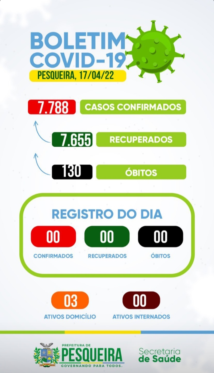 A Secretaria de Saúde informa aos munícipes o boletim da Covid-19 atualizado em 17 de abril de 2022.